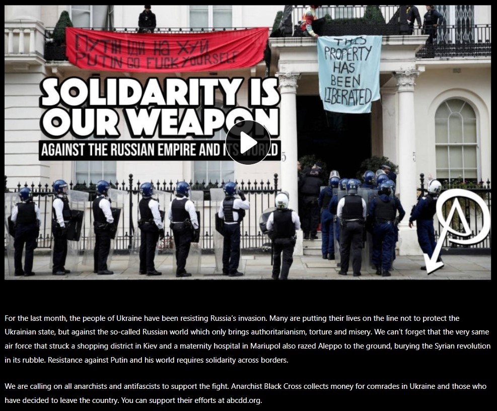 The video was made to help raise funds to support anarchist comrades in Ukraine, and anarchist refugees who have left the country. If you think that is a US State Department position, then I would respectfully suggest you re-examine your binary view of the conflict. As for Russia’s official state narrative on the ‘special operation’, both Ukraine and Russia have neo-nazi elements in their armed forces. The video we put out was a pretty modest effort to encourage people to offer direct support to people on the ground who are not only not nazis, but who are much more strategically placed to ultimately fight against fascism in Ukraine than an invading foreign army.