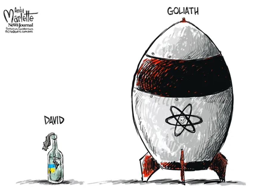 The western mainstream narrative certainly agrees with him. It casts Ukrainian President Zelensky in the role of David and Russian President Putin as Goliath. As early as March 6, 2022, CBS Sunday Morning aired a clip showing that already several news programs had implemented the narrative. Then on April 26, 2022, US President Biden goes as far as to say, “For God’s sake this man cannot remain in power.”